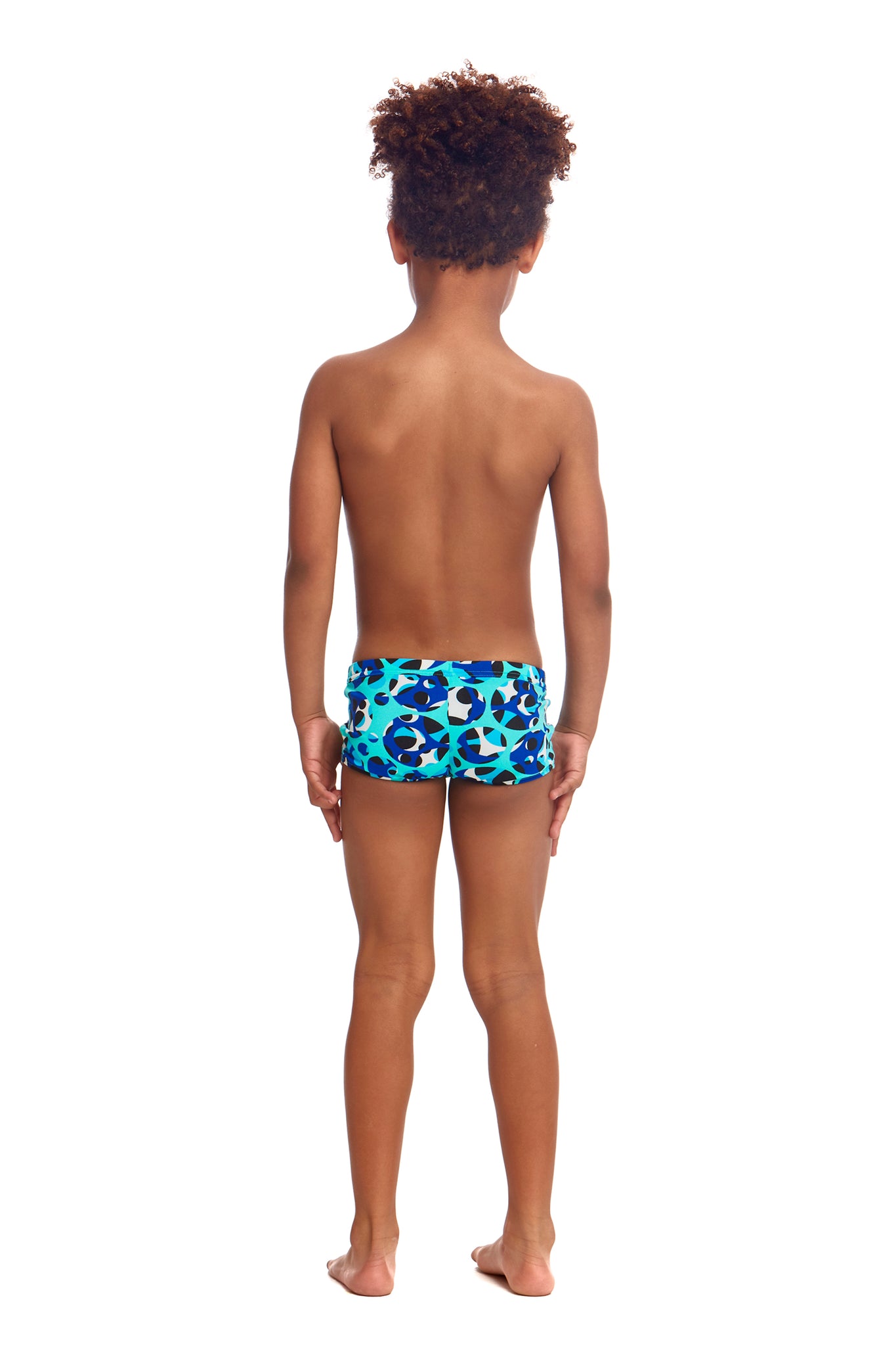 Square cut fitted trunk with extra leg length. Waistband with drawstring. Funky Trunks embroidery on front leg. Front polyester lining and flatlock stitch detail.